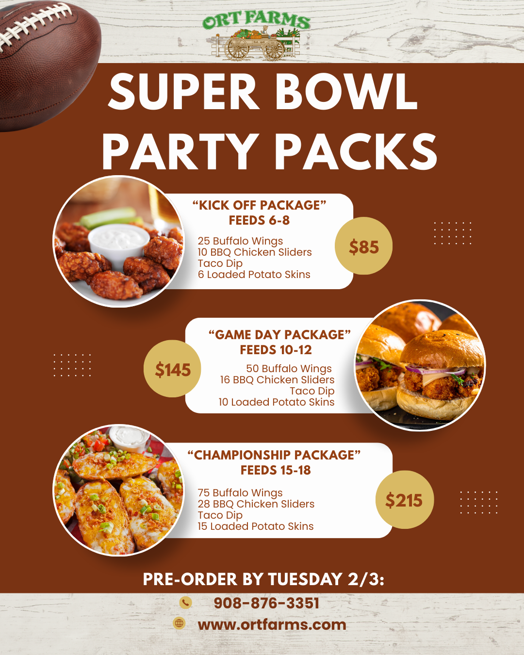 Pre-order your Super Bowl party packages by February 2nd and make game day effortless—and delicious.